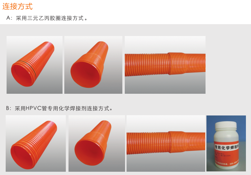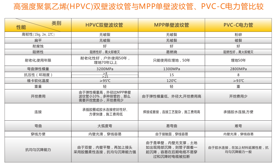 高強(qiáng)度聚氯乙烯(HPVC)雙壁波紋管內(nèi)、外壁之間呈中空環(huán)狀結(jié)構(gòu),充分利用工字鋼結(jié)構(gòu)原理,提高截面 慣性矩,環(huán)鋼度高。產(chǎn)品具有強(qiáng)度高、韌性好、質(zhì)地輕等優(yōu)點(diǎn)。產(chǎn)品運(yùn)用開(kāi)挖工程,可代替MPP單壁波紋管、玻璃鋼管、PVC-C電力管、PVC-U通信管等管材。
